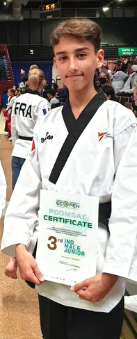 Jeune Sportif de haut niveau en Taekwondo, Guillaume a été Vice-champion d’Europe en trio 2021 au Portugal, 1er en individuel en Espagne en 2022, 8ème au championnat du Monde par équipe en Corée en 202 et tout récemment 5ème en individuel à l’Open de France en 2023.